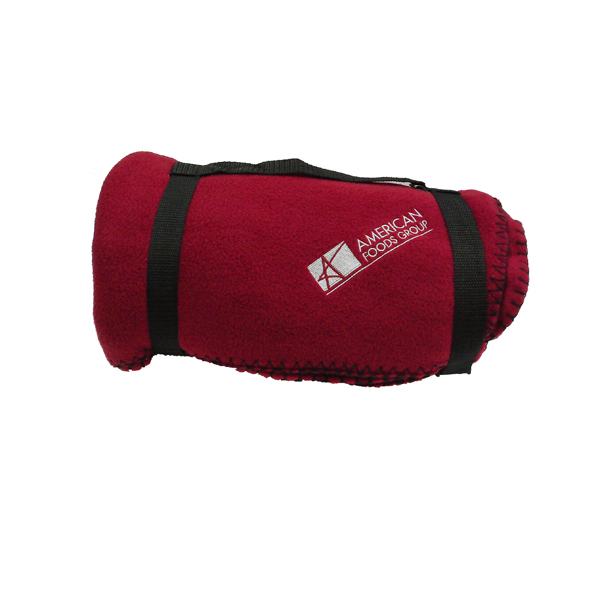 365 Gram Whipstitched 50" x 60" Fleece Blanket with heavyweight nylon stadium carrying strap.