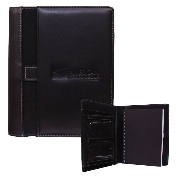 100 sheets of lined paper. 5" x 8" spiral bound journal refill. Interior organizer features a two-tiered business card holder with clear ID windows on top. Additional pockets for business cards, notes, and files. Internal pen loop. External elastic loop for pen or USB flash drive holder.Includes important contacts page and 3 -year calendar.