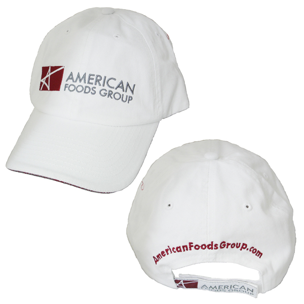 Sport your style with these comfortable 100% cotton caps. Low profile, unstructured garmet washed cap. Cloth back with a slider buckle. One size fits all. White with American Foods Groups Logo.